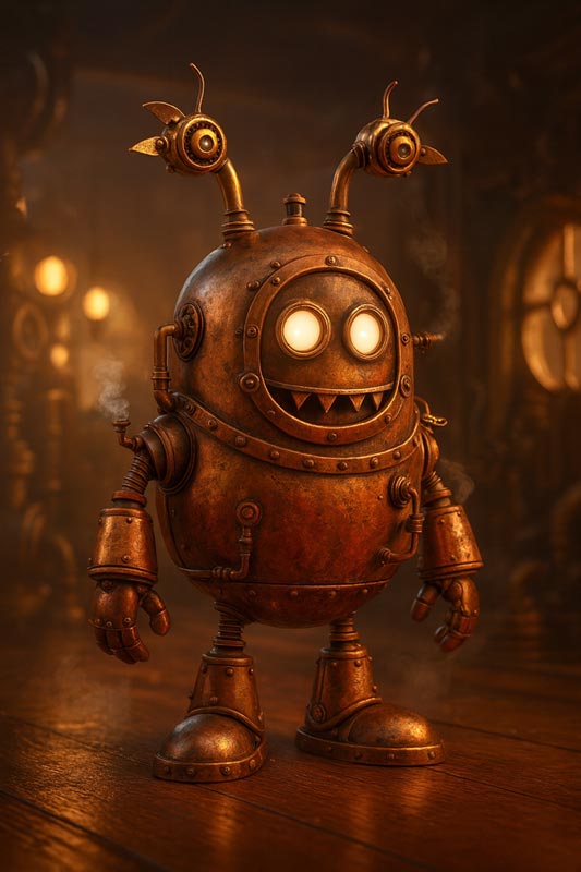 Child's original drawing of a robot.AI-transformed robot image in Steampunk style.Please turn this drawing into a Pixar-quality 3D render in a Steampunk style. Keep the robot’s shape and personality true to the child’s original drawing, but bring it to life with detailed Steampunk textures — like aged brass, polished copper, gears, cogs, and small steam pipes. Give it warm lighting with soft reflections to create a cinematic, high-quality look. The robot should have expressive eyes or lights, a slightly worn but friendly appearance, and visible mechanical details that make it look handcrafted. Place it in a retro-futuristic setting filled with soft light and a bit of steam, so it feels like a moment from a Pixar film.