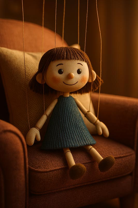 Finished AI render of the child's drawing, transformed into a high-resolution puppet as per the brief entered via the prompt.The child's original drawing of a girl.I’ve uploaded an image of a child’s drawing of a girl. Using only that person (i.e. ignoring the child’s hands, finger(s), pencil/crayon, tabletop, border, etc.), please render it in the style of a child’s doll-like puppet, with fabric clothing, a china/porcelain-like head with fake hair, strings coming from above (for the puppet element) attached to limbs, head, legs etc. It should be situated on a child’s comfy bedroom chair, leaning against a cushion. Soft, warm, lighting as if the sunset sun is lighting it through a window that’s not in view.